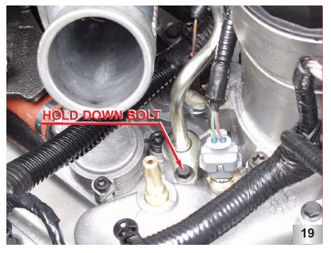 • Prior to tightening the retaining bolt, reposition the oil supply line, as necessary, in order to install the two turbo mounted oil supply line bolts, located on the center section of the turbo.