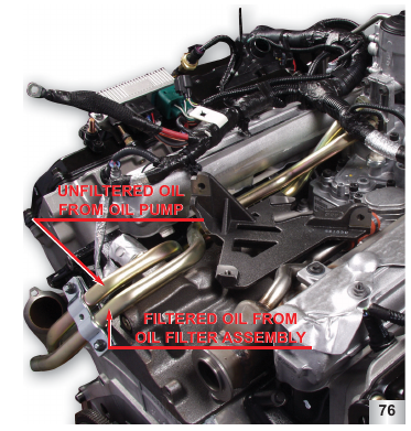 • As the oil line leaves the oil filter header, it drops down and passes under the turbocharger mounting bracket.