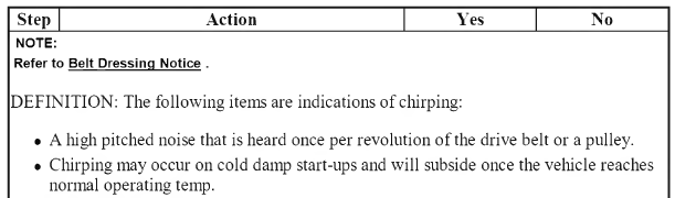 • A chirping or squeal noise may be intermittent due to moisture on the drive belts or the pulleys. It may be necessary to spray a small amount o f water on the drive belts in order to duplicate the customers concern. If spraying water on the drive belt duplicates the symptom, cleaning the belt pulleys may be the probable solution.