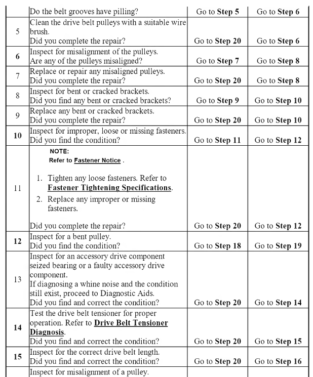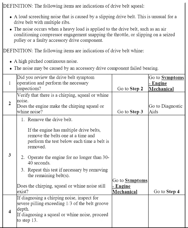 • If the noise is intermittent, verify the accessory drive components by varying their loads making sure they are operated to their maximum capacity. An overcharged A/C system, power steering system with a pinched hose or wrong fluid, or a generator failing are suggested items to inspect.