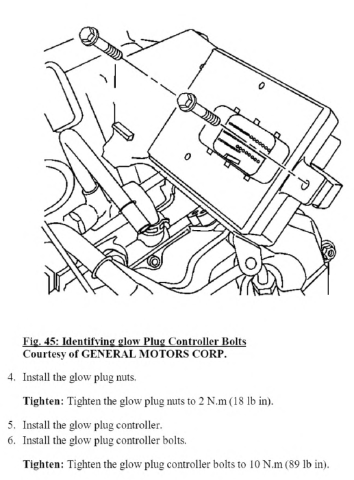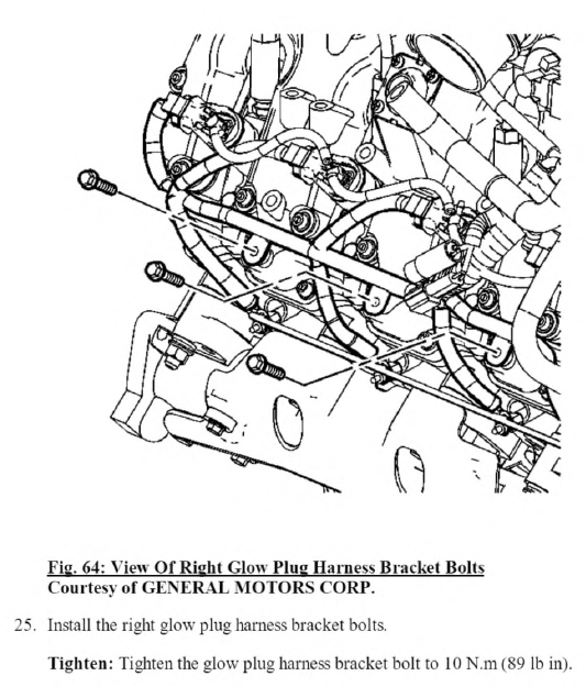 Tighten: Tighten the glow plug harness bracket bolt to 10 N.m (89 lb in).
