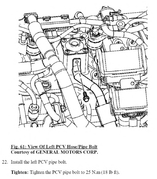 Tighten: Tighten the PCV pipe bolt to 25 N.m (18 lb it).