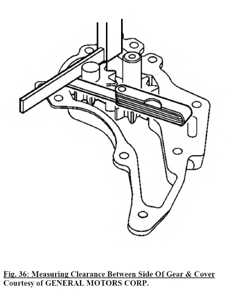 5. Use a feeler gauge and a straightedge to measure the clearance between the side o f the gear and the cover. The production clearance is 0.064-0.109 mm (0.0025-0.0043 in) and the service limit is 0.109 mm (0.0043 in).