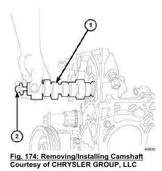 2. Install a long bolt (2) into the front of the camshaft to aid in the installation, carefully install the