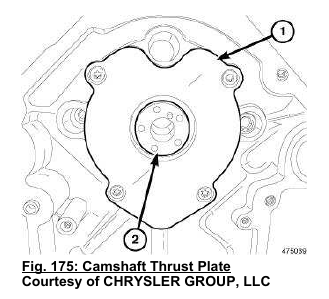 3. Install the camshaft thrust plate (1) and tighten retaining bolts to 12 N.m (106 in. lbs.).