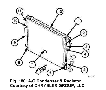 10. Install the A/C condenser (7). Refer to CONDENSER, A/C, INSTALLATION .