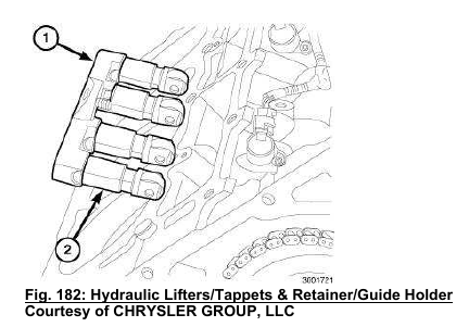 14. Install the lifters (2) and retainer (1) as an assembly into their original location. Refer to LIFTER (S), HYDRAULIC, ROLLER, INSTALLATION.