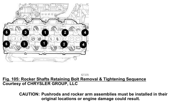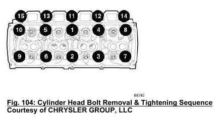 CAUTION: The 6.4L engine uses a unique 4 layer steel head gasket that must be compressed evenly and completely across the deck surface for proper sealing. The tightening sequence shown in the following illustration must be followed to ensure all layers are compressed before applying the additional 90 degree turn.