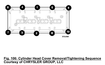 10. Position the cylinder head covers, using the sequence shown in illustration, tighten the cylinder head cover bolts to 8 N.m (70 lbs in.). Refer to COVER(S), CYLINDER HEAD, INSTALLATION.