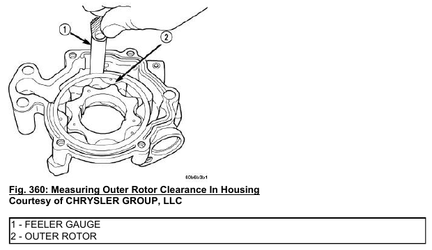 3. Slide the outer rotor into the body of the oil pump. Press the outer rotor to one side of the oil pump body and measure the clearance between the outer rotor (2) and the body. If the measurement is 0.235 mm (0.009 in.) or greater the oil pump assembly must be replaced.