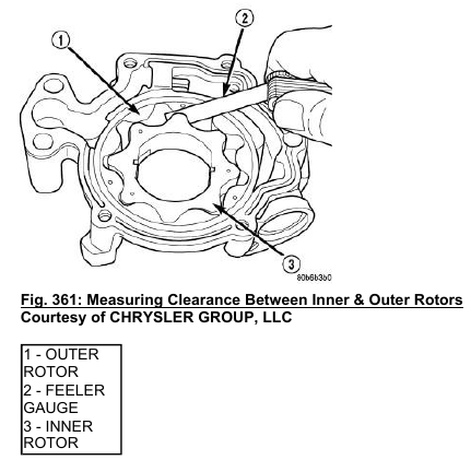 4. Install the inner rotor into the oil pump body. Measure the clearance between the inner (3) and outer (1) rotors. If the clearance between the rotors is.150 mm (0.006 in.) or greater the oil pump assembly must be replaced.