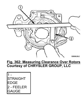5. Place a straight edge (1) across the body of the oil pump (between the bolt holes), using a feeler gauge (2), measure the clearance between the straightedge and the rotors. If the clearance is.095 mm (0.0038 in.) or greater the oil pump must be replaced.