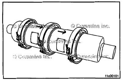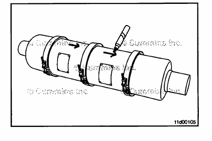 Draw an orientation reference line across each of the V- band clamps, aftertreatment canister sections, and