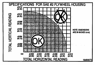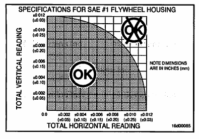 Use a straightedge to find the intersection point of the total horizontal and total vertical values. The intersection point must fall within the shaded area for the flywheel housing concentricity to be within specification.