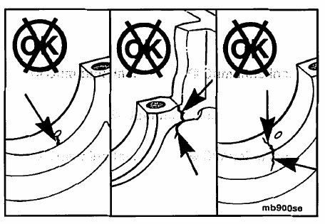 Inspect the main bearing caps and main bearing saddle areas for cracks, fretting and signs of discoloration.