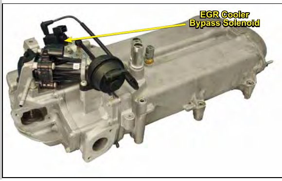 The EGR cooler bypass solenoid changes the state of the EGR cooler bypass door to either allow exhaust gases to bypass the EGR cooler or direct the gases through the cooler.