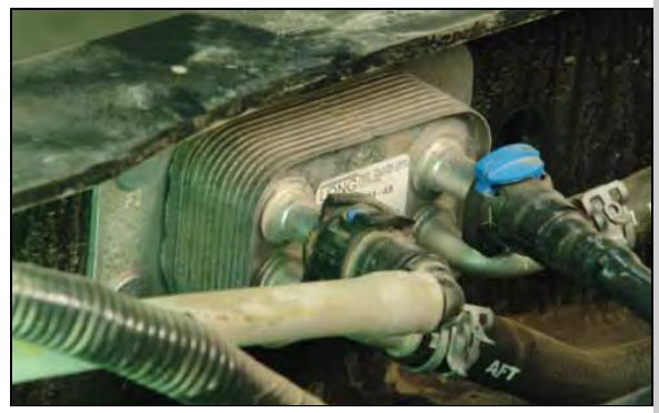 A fuel cooler is located on the left frame rail forward of the DFCM. The black fuel line is used for fuel return