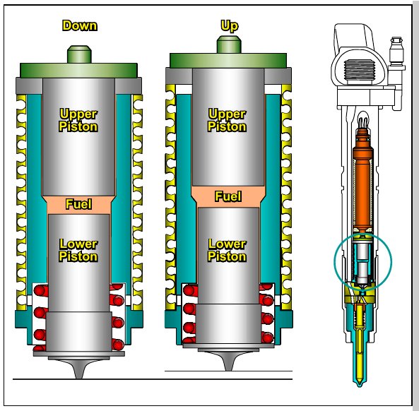 The piezo stack is linked to the control valve of the fuel injector via a fuel-filled hydraulic coupler. The upper piston of