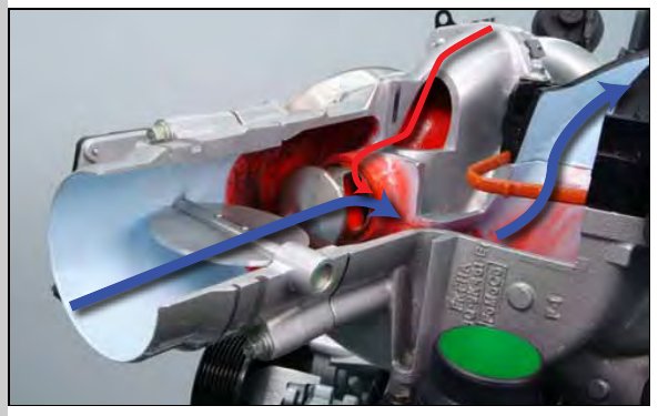 After leaving the turbocharger outlet the air goes through the CAC and then through the intake throttle body before it is mixed with exhaust gases from the EGR valve. The blue line represents the flow of cooled intake air and the red line represents the flow of EGR gases.