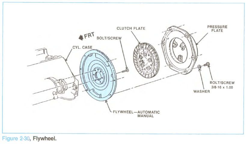 The 6.2L diesel engine has 2 flywheels, one to be used for automatic transmissions and one for manual transmissions. The automatic flywheel is made of a heavy steel stamping and the manual flywheel is made of cast iron. See Figure 2-30.