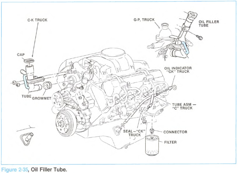 During late 1983 Model Year production, a vented oil fill tube (14071059) replaced the non-vented tube (Figure 2-35).