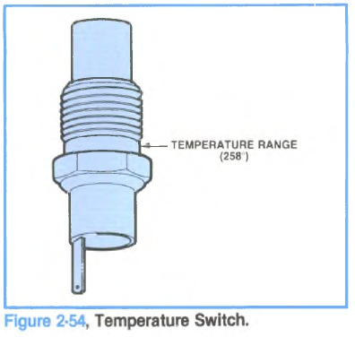 A temperature switch (Figure 2-54) activates a warning lamp in the instrument cluster should excessive coolant temperatures prevail in the engine. With optional instrumentation, a temperature gage replaces the warning lamp and the temperature switch is replaced with a transducer.