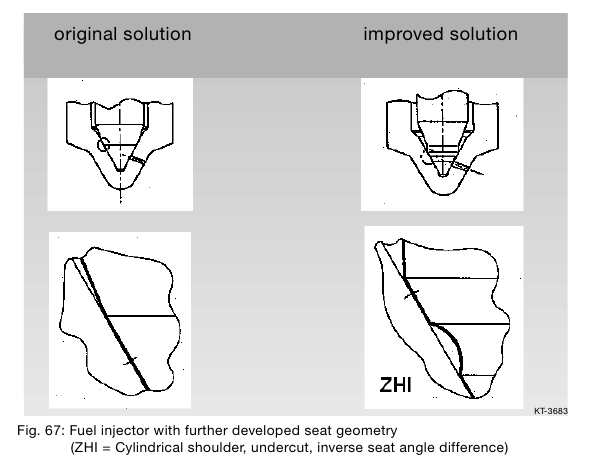 A highly developed lodgment geometry is also in service with the designation ZHI (cylindrical attachment, undercut, inverse lodgment angle difference). It is designed as what is known as a lodgment aperture nozzle. See following figure. The pressure compensation at the undercut creates symmetrical spraying. In addition, this lodgment geometry does not allow for any tendencies for increased quantities (quantity drift) as a result of wear to the unit.