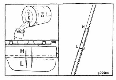Allow the lubricating oil to drain into the lubricating oil pan, and measure the lubricating oil level with the dip­stick.