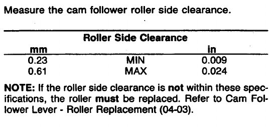Use a dial indicator to measure the cam follower to roller pin clearance.