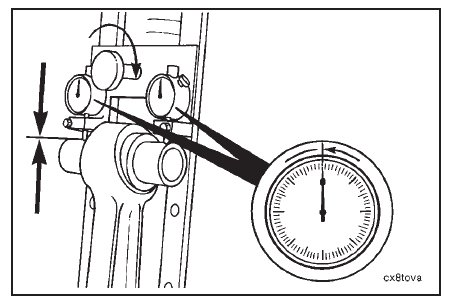Move the dial holder to position the contact points of the indicators on the mandrel in the piston pin bore.
