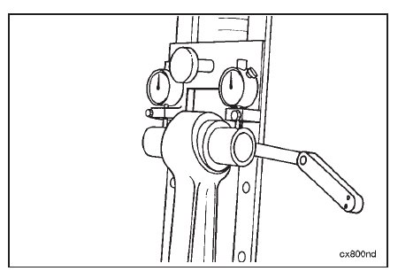 Using a feeler gauge, check the clearance between the mandrel and the dial indicator holding plate as shown.