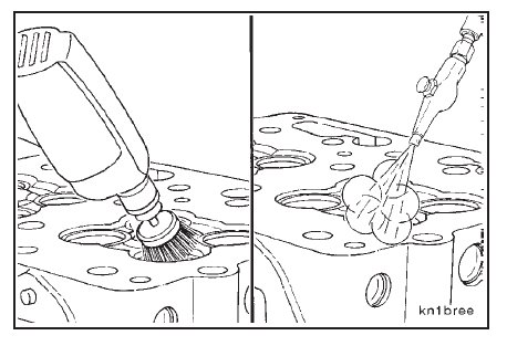 Use a wire brush and solvent to clean the deposits from the valve seat insert bores.