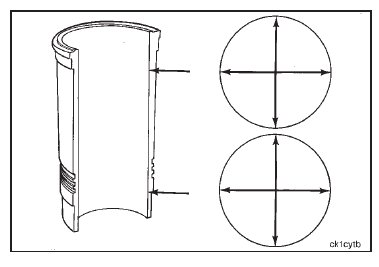Use a dial bore gauge to measure the liner inside diameter in four places 90 degrees apart at the top and the