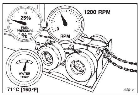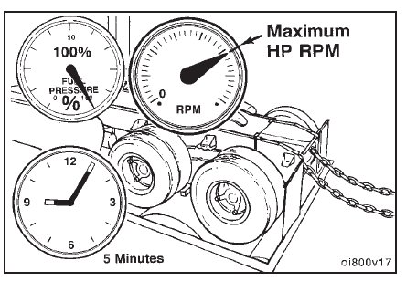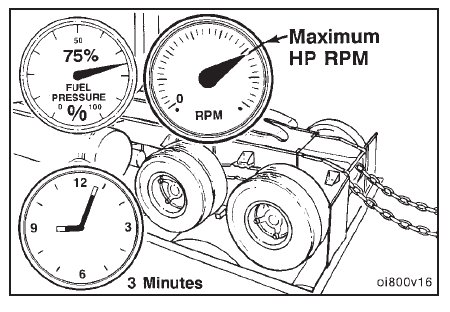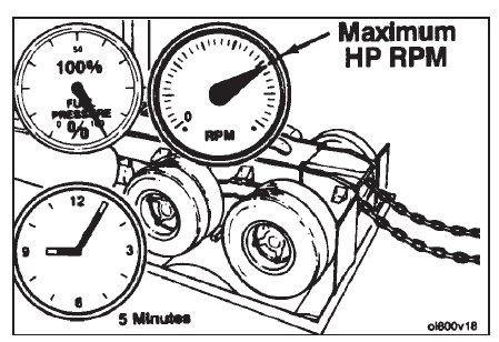 Operate the engine at maximum horsepower RPM and Advertised Horsepower with a wide open throttle, for 5 minutes. Check the gauges, and record the readings.