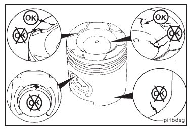 Visually inspect the piston bowl, the pin bore, and the skirt for cracks or damage.
