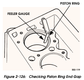 1. Check end gap of all rings. Insert ring in bore and push it down until its about 1-2 inches (2.5-5 cm) below top edge of bore. Verify that ring is level, then check end gap with feeler gauge (Figure 2-126). Correct end gaps are: