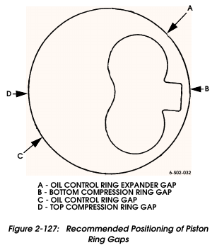 4. Position ring end gaps as shown (Figure 2-127). This avoids ring gap alignment which will cause loss of compression, blow by, and oil consumption.