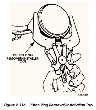 Remove and discard the old piston rings. Use a remover/installer tool similar to parallel jaw type tool shown (Figure 2-116). Discard rings after removal.