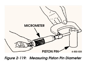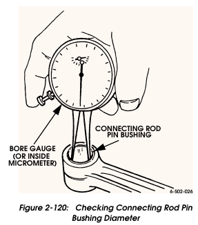 Measure pin bushing diameter in connecting rod with small bore gauge or inside micrometer (Figure 2-120). Record bushing diameter and compare it to diameter of new or known good piston pin. The difference between the two measurements represents the piston pin-to-connecting rod pin bushing clearance. Required clearance is 0.0003-0.001 in. (0.0081-0.0309 mm). Replace the connecting rod if the bushing is worn oversize. The bushing is not serviced separately.