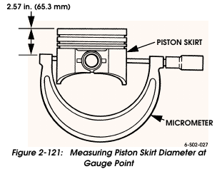 Measure piston skirt diameter at, or just below the pin bore centerline. The correct gauge point is approximately 2.57 in. (65.3 mm) down from the piston crown (Figure 2-121). Be sure measurement is taken at a point opposite (at right angle to) the pin bore centerline as shown. Replace the pistons if wear is such that piston-to-bore clearance would be greater than: