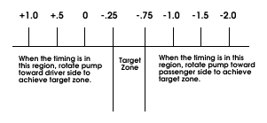 • If value is between plus 1.0 and minus 0.25, rotate pump toward driver side to achieve specified value.