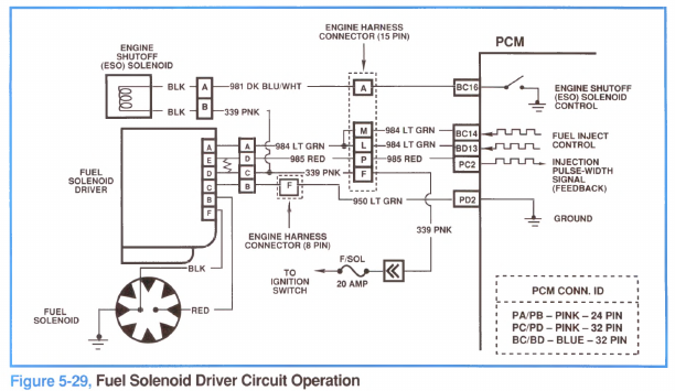 The fuel solenoid driver receives an inject-command signal from the PCM on CKT 984 (figure 5-29). The driver provides current-regulated output to the fuel solenoid that controls fuel pump metering injection. The driver also returns an injection pulse-width modulated (PWM) signal back to the PCM on CKT 985. This signal tells the PCM when the fuel solenoid plunger seats. The PCM uses a calibrated injection pump-mounted resistor to determine fuel rates. The resistor value of the pump is stored in PCM memory. If PCM memory has been disturbed or the PCM has been replaced, the PCM will relearn the resistor value on the next ignition cycle and store this value.