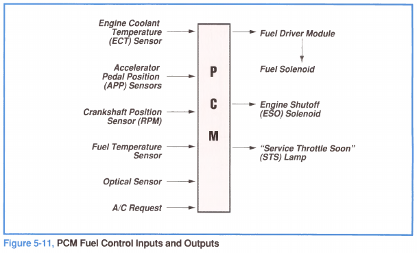 The PCM uses information regarding engine coolant temperature, engine speed, accelerator position, fuel temperature, the optical sensor, and air conditioning status to calculate when to energize the fuel solenoid driver (figure 5-11). The PCM also illuminates the “Service Throttle Soon” lamp and/or Malfunction Indicator Lamp (MIL) in the instrument panel to alert the driver to conditions requiring service.