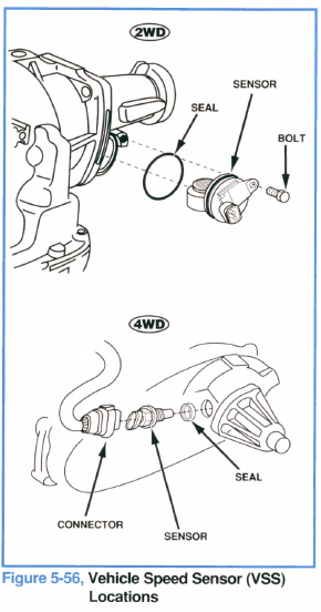 • Four-wheel-drive systems use both a transmission output speed sensor and a VSS sensor. The VSS is located on the transfer case.