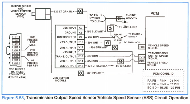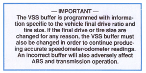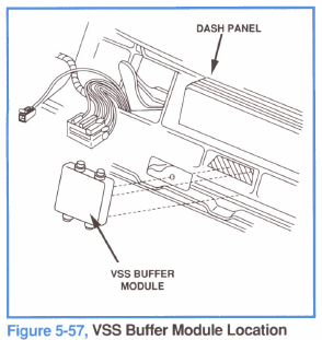 The VSS signal is sent to a Vehicle Speed Sensor (VSS) Buffer Module (figure 5-57). The module acts as a signal interpreter. It changes the AC voltage of incoming sensor signals so they can be used by the PCM. The module outputs a 4000-pulse-per-mile signal to the PCM. The buffer also emits signals used by other functions such as the Antilock Brake System (ABS) and speedometer/odometer.