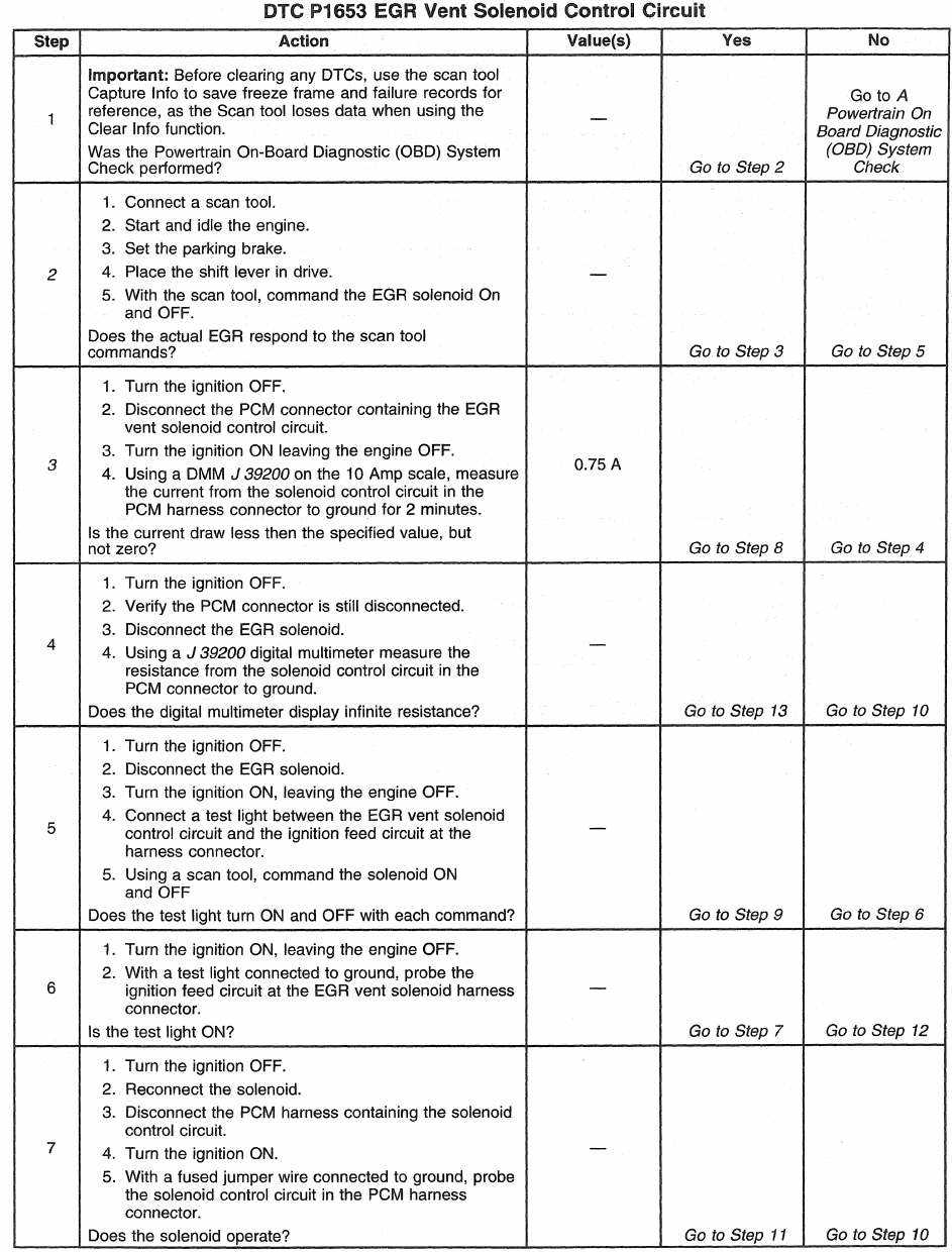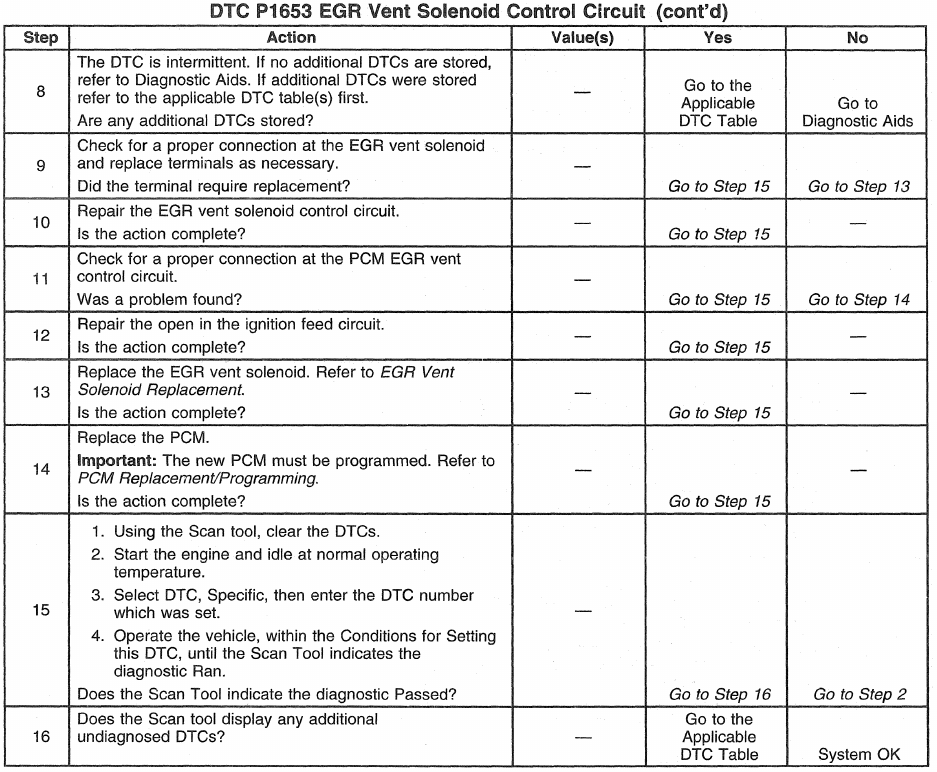 The scan tool has a 5 second ON time abort. The EGR vent solenoid can be commanded ON for as many times as needed, in 5 second intervals. Its possible other EGR DTCs may set along with DTC P1653. This diagnostic can be checked at key up. A quick operational check can be made by commanding the EGR vent solenoid ON and OFF with the scan tool while monitoring Actual EGR. Actual EGR will display BARO (approximately) when EGR solenoid is OFF.