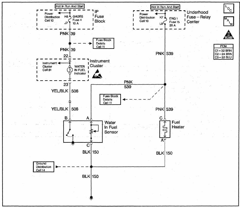 A time delay circuit in the water in fuel module grounds the lamp briefly to test the bulb each time the system is turned ON.