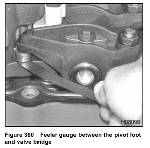 4. Check cold valve lash with a (0.019 in) feeler gauge between the pivot foot and valve bridge.