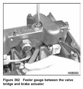 1. Check cold brake lash with a (0.019 in) feeler gauge between the actuator and valve bridge. If adjustment is                  required, loosen the locknut and turn the actuator adjustment screw until a light drag is felt.