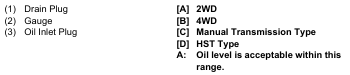 • After running the engine for a few minutes, stop it and check the fluid level again, if low, add fluid prescribed level       “A”.